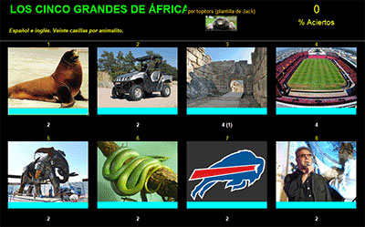 pero no, Topitors a partir de 5 grandes animales africanos nos ha creado el juego con la intención de localizar 100 cosas, lugares, personas, … que en su respuesta lleva el nombre de uno de estos cinco animales. Como bien nos indica hay 20 respuestas por animal.