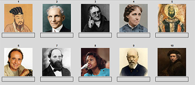100 personas, seleccionadas por Guillermo que han influido en la historia o son conocidos por sus logros, filósofos, músicos, políticos, médicos, …